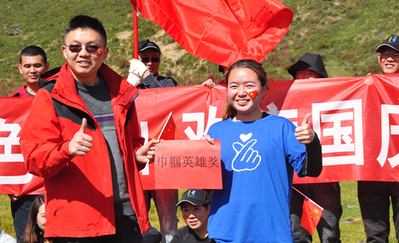登山团建活动在迎风飘扬的五星红旗下,在参加活动人员《歌唱祖国》的嘹亮歌声中达到高潮,大家满怀激情祝福伟大祖国母亲的生日,祝愿祖国繁荣富强!